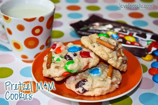 Scoop onto a cookie sheet. Add a couple extra M&M’s and pretzels to the top of the cookie. This will ensure that you will really be able to see them after they bake! It really makes a difference in presentation!