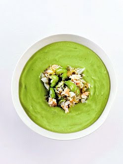 Divide soup among 4 bowls. Spoon crab salad into center of each bowl.