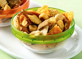 1. In large microwavable bowl, mix cereals, peanuts, pretzels and corn kernel nuts.