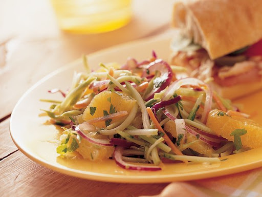In large bowl, mix broccoli slaw and jicama. Peel oranges with sharp paring knife; cut into 1/4-inch slices. Cut each slice into fourths. Add oranges, onion and cilantro to broccoli mixture.