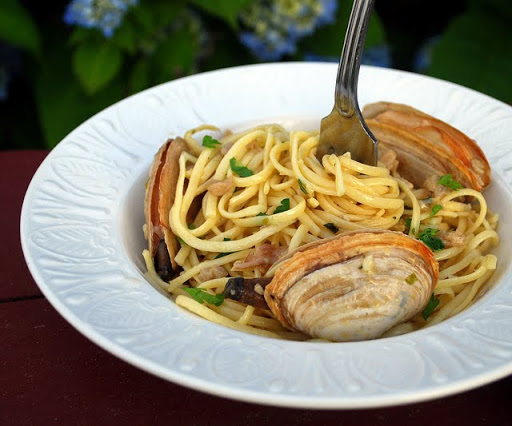 I steamed some fresh local steamers to top off my dish. Delicious and they look pretty too!