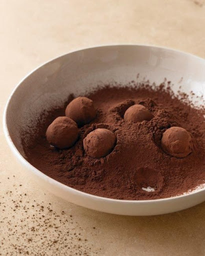 Transfer chocolate to a shallow bowl or dish and let cool in refrigerator for 1 to 2 hours. Scoop into balls and place on parchment or waxed paper. At this point you can roll the truffles in cocoa powder to coat. When I am using coconut or nuts, I find that I need to warm the truffles by rolling them in my hands to get the coarser toppings to stick.