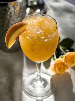 In a shaker glass add the peach, mint leaves, lemon and orange and muddle together.