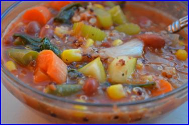 In a large pot, add the olive oil, garlic, and onion and cook on medium heat until the onions are translucent. Add the yellow squash, zucchini, celery, carrots, tomatoes, oregano, basil, and black pepper and cook for 10 minutes. Add the kidney beans, navy beans, chopped tomatoes, spinach, and broth and continue to cook soup on medium heat. In a small pot, add the quinoa and water. Cook the quinoa until a boil then reduce heat to a simmer until the quinoa absorbs all the water. Add the quinoa to the soup. Cook soup for another 10 minutes or until ready to serve. Optional: Sprinkle individual servings with parmesan and Asiago cheese.