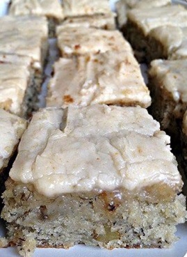 For the bars, in a large bowl, beat together sugar, sour cream, butter, and eggs until creamy. Blend in bananas and vanilla extract. Add flour, baking soda, salt, and blend for 1 minute. Stir in walnuts.