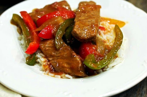 Brown steak slices and then sprinkle with paprika. Add in onions, tomatoes, beef stock, and garlic. Place cover over pot and allow to simmer for about 1 to 1 1/2 hours until meat is tender.