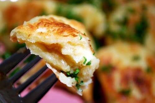 1. Turn dough out onto a lightly floured surface. Knead a couple of times and then roll out until 1/8 of an inch thick. Cut into 20-25 round using a 3 ½ inch biscuit cutter or drinking glass. Place rounds on a floured baking pan. Scoop a flat tablespoon of filling onto half of each round and brush water on half of each round. Fold round over, sealing the edges and making sure no filling escapes or oozes out. This is very similar to gyoza making, but requires less finesse as crimping is optional.