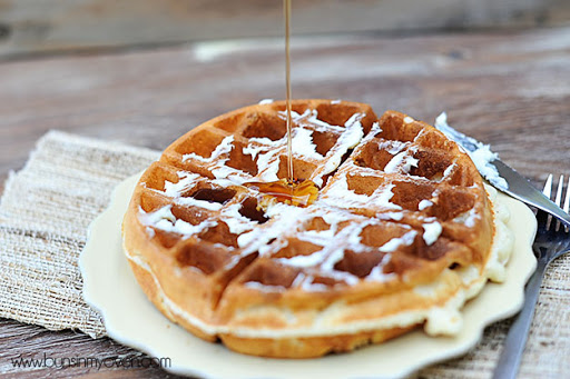 Pour the batter onto the hot waffle iron (My Belgian waffle maker takes 2 1/2 ice cream scoops of batter, but your mileage may vary) and cook until the waffle is crisp and brown.