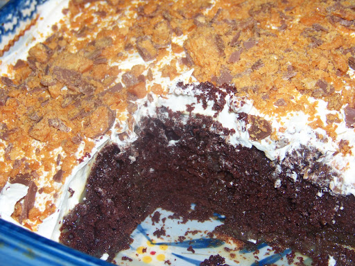 Prepare the cake mix in a 9×13, according to the package directions. As soon as the cake is finished baking, poke holes all over it with a fork. Whisk together sweetened condensed milk & caramel ice cream topping. Pour it over the hot cake. Let cool. Spread cool whip on top and sprinkle with butterfingers crumbs. Keep in refrigerator.