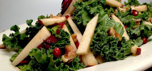 Here's a holiday salad that no one will overlook. It's festive, fruity, fabulously delicious and good for you. Dressed up with kale, pomegranate seeds, walnuts and pears, who could ever pass on this one?