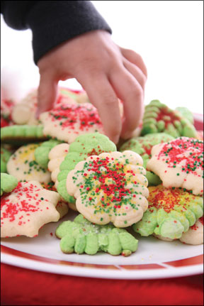 5. Pack the dough into a cookie press. Place the face of the press firmly down on an ungreased cookie sheet and press out cookie, a single press for each cookie. Space cookies about 1 inch apart. Decorate with colored sugar, sprinkles, etc.