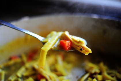 Remove chicken from pot with a slotted spoon. With two forks, remove as much meat from the bones as you can, slightly shredding meat in the process. Return bones to broth and simmer on low, covered, for 45 minutes.