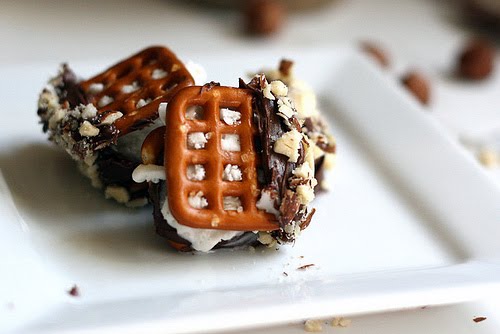 Place a sheet of wax paper on a small freezer-safe plate or pan. Place about a dozen pretzels on the wax paper. You'll want to work in smallish batches, around 12, because the ice cream melts quickly. Smear some Nutella on a small amount of pretzels. Top with about a teaspoon of ice cream and place another pretzel on top.