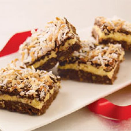 LINE 13x9-inch pan with foil, with ends of foil extending over sides; spray with cooking spray. Microwave 5 oz. chocolate and 1/2 cup butter in medium microwaveable bowl on HIGH 2 min. or until butter is melted; stir until chocolate is completely melted and mixture is well blended. Stir in graham crumbs, nuts and 1 cup coconut; press onto bottom of prepared pan. Refrigerate 15 min.