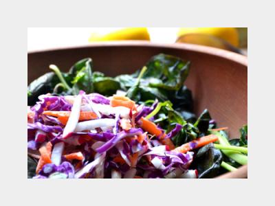 COMBINE all salad ingredients in a large salad bowl; set aside.