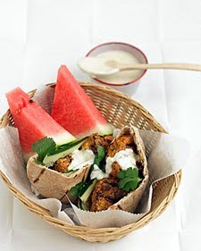 5.Halve pitas crosswise (toast on grill, if you like). Into each pocket, place 2 chicken patties, cucumber slices, and cilantro sprigs. Serve with Cumin Yogurt Sauce