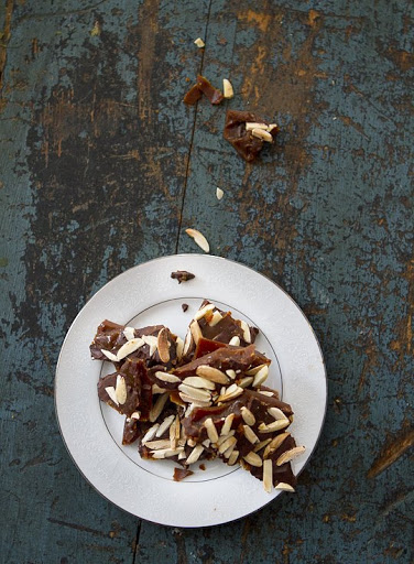 Pour the mixture onto the lined baking sheet. Allow it to cool slightly, about 5 minutes, then sprinkle the mixture with the chocolate. When the chocolate looks glossy, spread it with an offset cake spatula or a wooden spatula, and sprinkle with the nuts. Gently press the nuts into the chocolate with the palms of your hands.