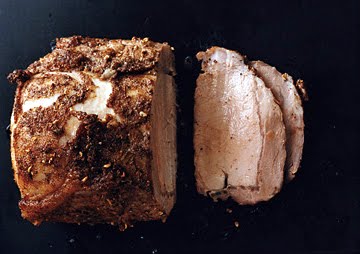 Put all the spices and the salt in a small bowl and stir to mix well. Use your fingertips to rub the spice blend all over the meat. Place the meat in the roasting pan with its largest surface facing up. With your fingers or a spoon, dab the remaining lard or drippings all over the top of the meat.