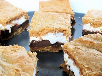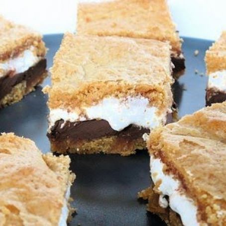 The campfire favorite s'more is remade in the oven for bite size snacks at anytime with this S'More Cookie Bar recipe.