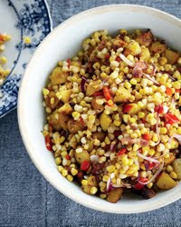 2. Pour off all but 3 tablespoons of the bacon fat in the skillet. Add the potatoes and cook over moderate heat until they start to brown, about 3 minutes. Stir and cook for about 2 minutes longer, until almost tender. Add the diced red peppers and cook, stirring occasionally, until the potatoes and peppers are tender, about 5 minutes. Add the corn kernels and cook, stirring, until heated through, about 3 minutes.