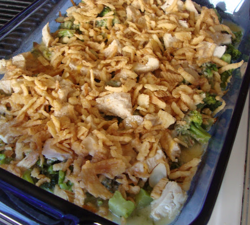 Place in prepared dish and top with French fried onions and cheese.