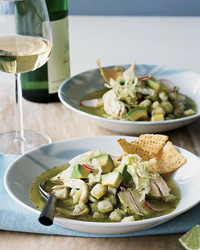 Pour the green sauce into the cooking liquid in the casserole. Add the hominy and bring to a simmer over moderate heat. Add the shredded chicken to the stew, season with salt and pepper and cook just until heated through. Serve the pozole in deep bowls, passing the lettuce, radishes, onion, avocado, sour cream, tortilla chips and lime wedges at the table.