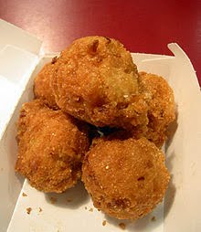 Heat oil to 350 degrees. Drop spoonfuls of batter into oil. Fry, turn after they rise to the top and are brown--5 minutes.