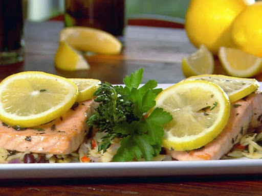 Using a large fish spatula, remove the side of salmon from the roasting pan and place on a platter. Garnish with sprigs of fresh rosemary and lemon wedges.