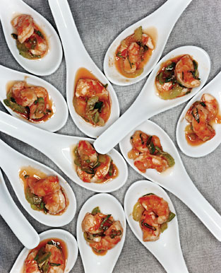Just before serving, stir sauce into shrimp mixture. Spoon 2 shrimp pieces with vegetables and sauce into each soupspoon and arrange spoons on a platter.