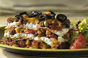 Layer on thrid of the meat mixture to one half each of the tortillas and cottage cheese in 13x9 inch baking dish. Repeat layers; cover with remaining meat sauce. Sprinkle with cheddar cheese and olives.