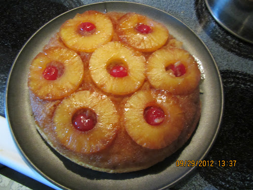 When the butter and sugar become melted and syrupy, add slices of pineapple with marashino cherries in the middle. Pour on batter.