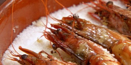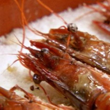Preheat the oven to 400 degrees F. Select a casserole dish, large enough to hold the shrimp in a single layer and at least 2 inches deep (5 cm). Add rock salt to form a 1 inch bed (2.5 cm) in the pan. Set the pan in the oven and heat for 30 minutes.