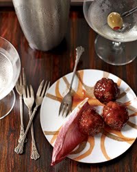 4. Using a slotted spoon, add the meatballs to the sauce and simmer over low heat until thickly glazed, about 15 minutes. Transfer the meatballs to a bowl and serve with picks.