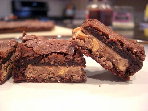 Line a 13 by 9-inch cake pan with aluminum foil and spray with vegetable oil cooking spray. Spoon in half of the brownie batter and smooth with a spatula or the back of a spoon. Place the candy bars side by side on top of the batter. Cover with the remaining batter.