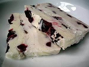 # Line an 8 x 4 inch loaf pan with plastic film allowing 6 inch overhang on each side. Put some of the cherries and chocolate evenly on the bottom of the pan then ladle about a third of the chilled cream and egg whites. Freeze for 15 minutes. Repeat layering procedure with the remaining cherries/chocolate and cream/egg whites. Cover top with the plastic film overhang. Freeze for 3 hours or overnight.