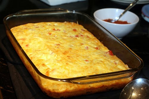 Preheat the oven to 375 degrees. In a sauté pan, heat oil over medium heat. Saute the bell peppers, onion and jalapeno for 3 minutes, until soft. Grease a 9x9 glass baking dish. Add the sautéed vegetables, tomatoes and tortilla chips to the prepared dish. Whisk the eggs, cream and ¾ cup of the cheese in a separate bowl. Pour the egg mixture in the prepared dish. Top with the remaining cheese. Bake for 30 to 35 minutes, until eggs are set. Serve with warm tortillas and fresh salsa.