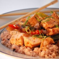 2.Heat a wok or large nonstick skillet until very hot. Add the oil and, when very hot, Add the red and green bell peppers and cook, stirring, for 2 minutes. Add the onion and cook, stirring, until just beginning to get tender, about 2 minutes longer. Then, add the garlic and ginger and cook until fragrant, stirring, about 10 seconds. Add the edamame and cook for 1 minute. Add the reserved rice wine-soy mixture and the turkey and bring to a boil, stirring. Drizzle the cornstarch mixture into the boiling liquid and cook, stirring, until sauce is thickened and veggies are just crisp-tender.