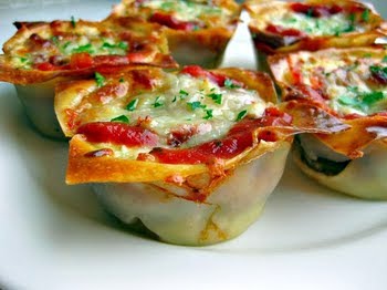 Coat a 12 cup muffin tin with nonstick cooking spray. Place 1 wonton wrapper into each of the 12 cups, pressing firmly in the bottom of the cup and up the sides. Using half of the ricotta mixture, divide it among the 12 muffin cups. Next, using half of the turkey tomato sauce, spoon it evenly over each of the ricotta filled cups. Sprinkle with 2 teaspoons of mozzarella. Gently press another wonton wrapper on top of the mozzarella layer.