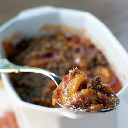 5. Sprinkle 1/2 cup crumbs in bottom of a 2 qt casserole coated with cooking spray. Add peach mixture, sprinkle with remaining crumb mixture. Cover and bake at 350 for 25 minutes; uncover and bake for 15 minutes or until bubbly.