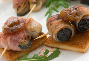 Place the dates on skewers and roast for 10 - 15 minutes or until bacon is crisp.