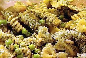 In the bowl of a food processor fitted with a steel blade, puree the pesto, spinach, and lemon juice. Add the mayonnaise and puree. Add the pesto mixture to the cooled pasta and then add the Parmesan, peas, pignolis, salt, and pepper. Mix well, season to taste, and serve at room temperature.