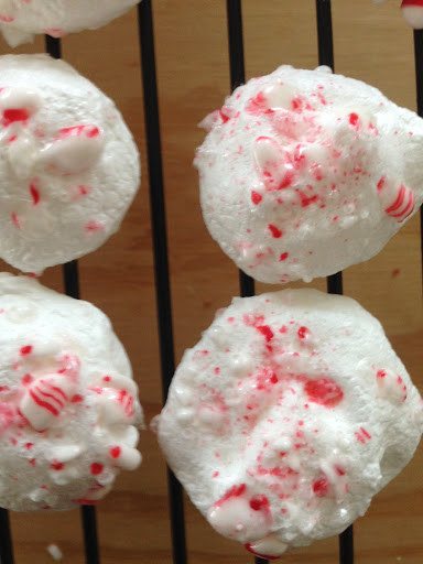 2.In a large glass or metal mixing bowl, beat egg whites, salt, and cream of tartar to soft peaks. Gradually add sugar, continuing to beat until whites form stiff peaks.Once stiff peaks form, then fold in by hand the peppermint extract. Drop by spoonfuls 1 inch apart on the prepared cookie sheets. Sprinkle crushed peppermint candy over the cookies.