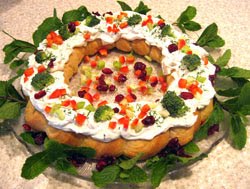 In a small mixing bowl, beat the sour cream, cream cheese, mayo, garlic powder, and dill until nice and smooth. Then, spread the mixture over the wreath and top with the chopped celery, broccoli, and red pepper. You can complete this pretty picture by making a bow with the leftover celery leaves.
