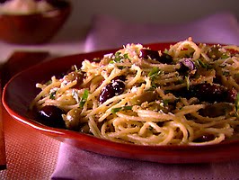 Drain the pasta, reserving 1 cup of the pasta water. Stir the pasta into the bread crumb mixture. Remove the pan from the heat and add the black and green olives. Add the Parmesan cheese and 3 tablespoons of the parsley. Season the pasta with salt and pepper, to taste. Gently toss to coat, adding reserved pasta water, if needed, to loosen the pasta. Transfer to a large serving bowl and garnish with the remaining parsley.