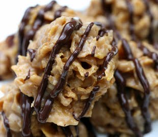 Add corn flakes to a large bowl. Pour peanut butter mixture over corn flakes and mix well, taking care to coat all of the corn flakes. With a tablespoon or cookie scoop, scoop out and form into 1-2 inch balls, depending on your preference, and place them on a cookie sheet lined with parchment or wax paper.