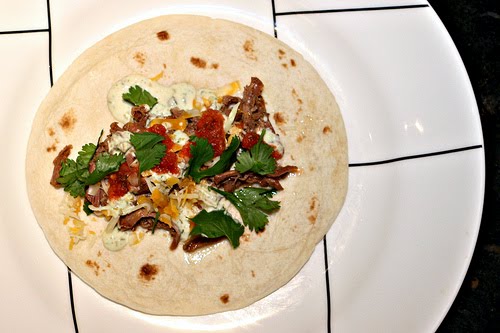 Combine all ingredients in a crockpot. Cover and cook on low for 6 to 8 hours. Shred the meat, return to the crockpot and cook for 20 minutes more. Serve on tortillas with Colby jack cheese, salsa, creamy jalapeno and fresh cilantro.