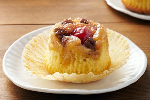 MIX sugar and butter in medium bowl; stir in pineapple and nuts. Place cherry half, cut-side up, in center of each of 24 paper-lined muffin cups. Cover with pineapple mixture.