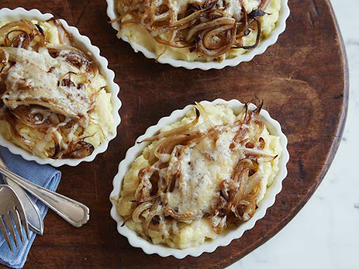 Arrange the mashed potatoes in individual gratin dishes or 1 shallow casserole. Top the potatoes with the onions and Gruyere cheese. Put them on a sheet pan and brown under a hot broiler until bubbly, about 2 minutes. Remove from the oven and serve hot.