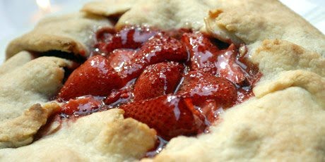 Heat the oven to 400°F/200°C. Mix the almonds, flour, and sugar. Roll out the chilled dough into a circle and set on a baking sheet. Spread the almond mixture over, leaving a 3-inch/7.5 cm margin. Toss the strawberries with the sugar and arrange on top. Fold the edges of the galette dough up over the berries and bake until the crust is crisp and golden, 20 to 25 minutes. Serve warm with sweetened whipped cream, flavoured with vanilla or cinnamon.
