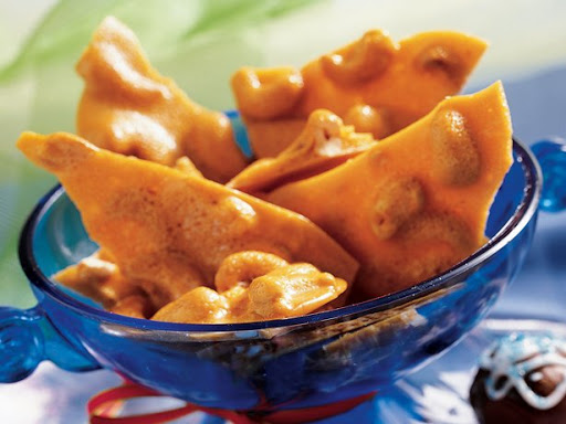 Stir in butter and cashews. Cook about 13 minutes, stirring constantly, to 300°F or until small amount of mixture dropped into cup of very cold water separates into hard, brittle threads. (Watch carefully so mixture does not burn.) Immediately remove from heat. Quickly stir in baking soda mixture until light and foamy.